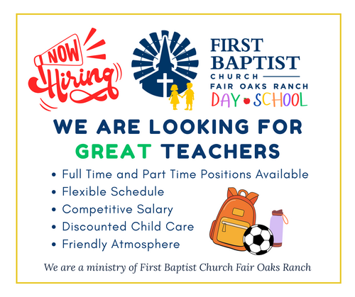 We are looking for loving, Christ-centered individuals to join our child care team at FBC Fair Oaks Ranch Day School, where we provide a safe, nurturing environment rooted in Biblical values. The ideal candidate will have a genuine love for young children, a personal relationship with Jesus Christ, and a passion for helping little ones grow spiritually, emotionally, and developmentally. Experience in early childhood education and the ability to create engaging, age-appropriate activities that reflect God’s love and truth are preferred. If you feel called to care for and guide young hearts in a Christ-honoring setting, please send your resume to kaitlyn@fbcfairoaks.org.